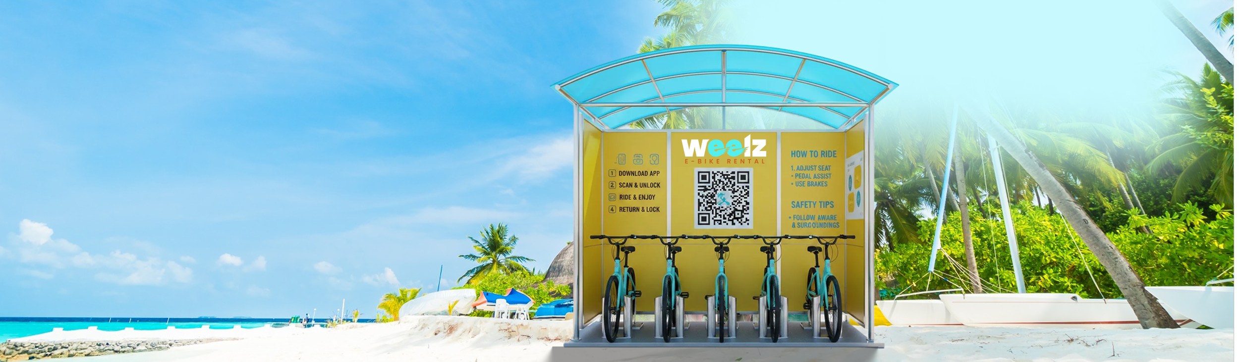 Weelz operates as a fully autonomous, self-powered system that does not rely on electricity or internet from host locations. Availability of bikes, charging status, and access may vary. Weelz does not guarantee uninterrupted service.